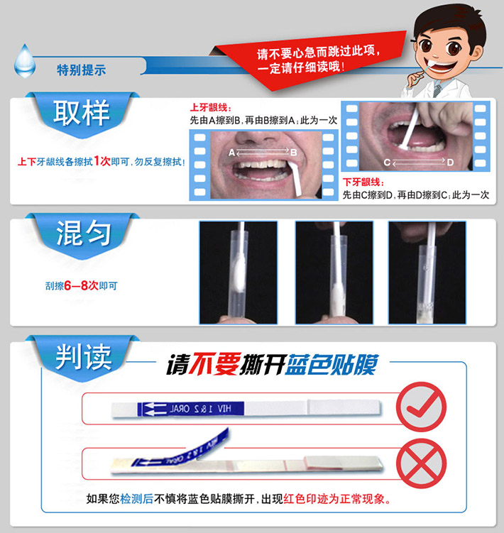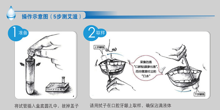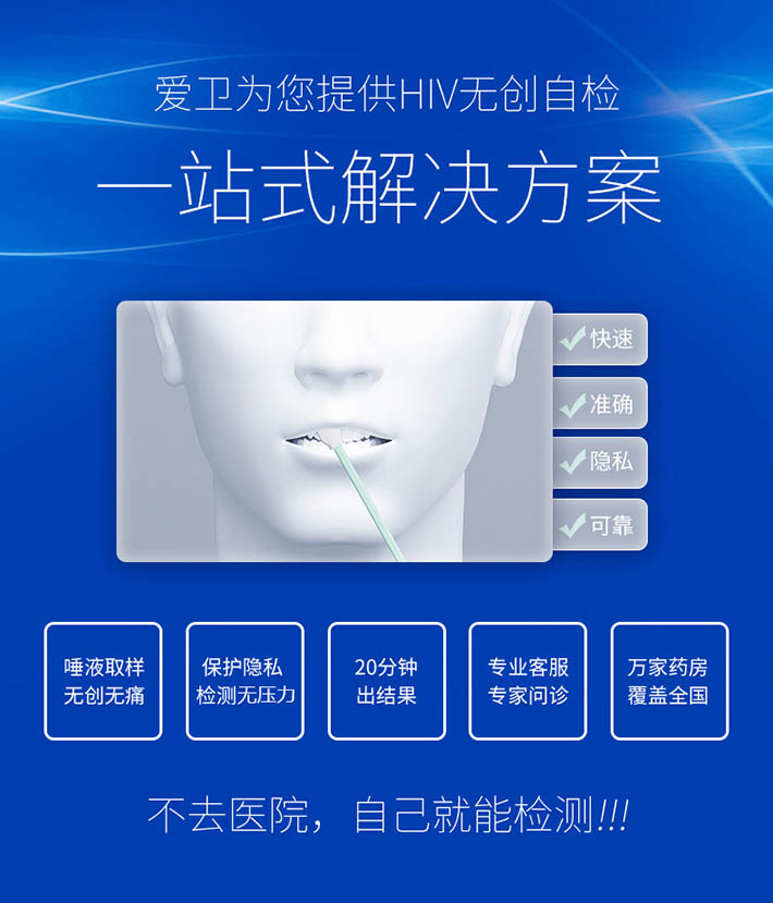 1.唾液与血液结合检测,更准备、更安全 2.二种不同品牌的艾滋病检测试纸 (交叉检测更安全) |