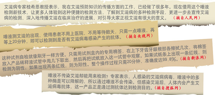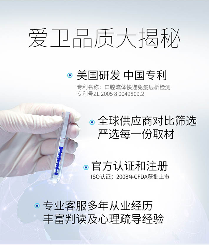 1.唾液与血液结合检测,更准备、更安全 2.产地的不同(国产与进口) 3.三种不同品牌的艾滋病检测试纸 (交叉检测更安全) |