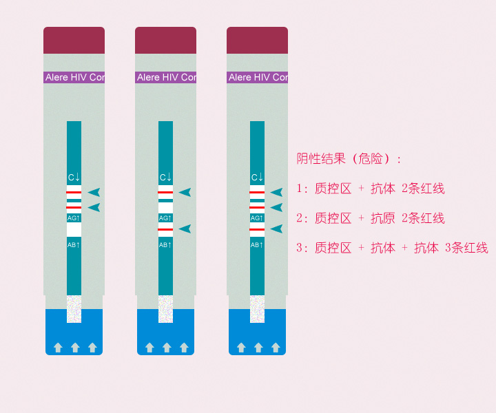 (2) 阳性(+)结果:有质控区红线+抗原红线,或质控区红线+抗体红线,或质控区红线+抗原红线+抗体红线,这是一个危险的结果,说明有可能感染HIV。